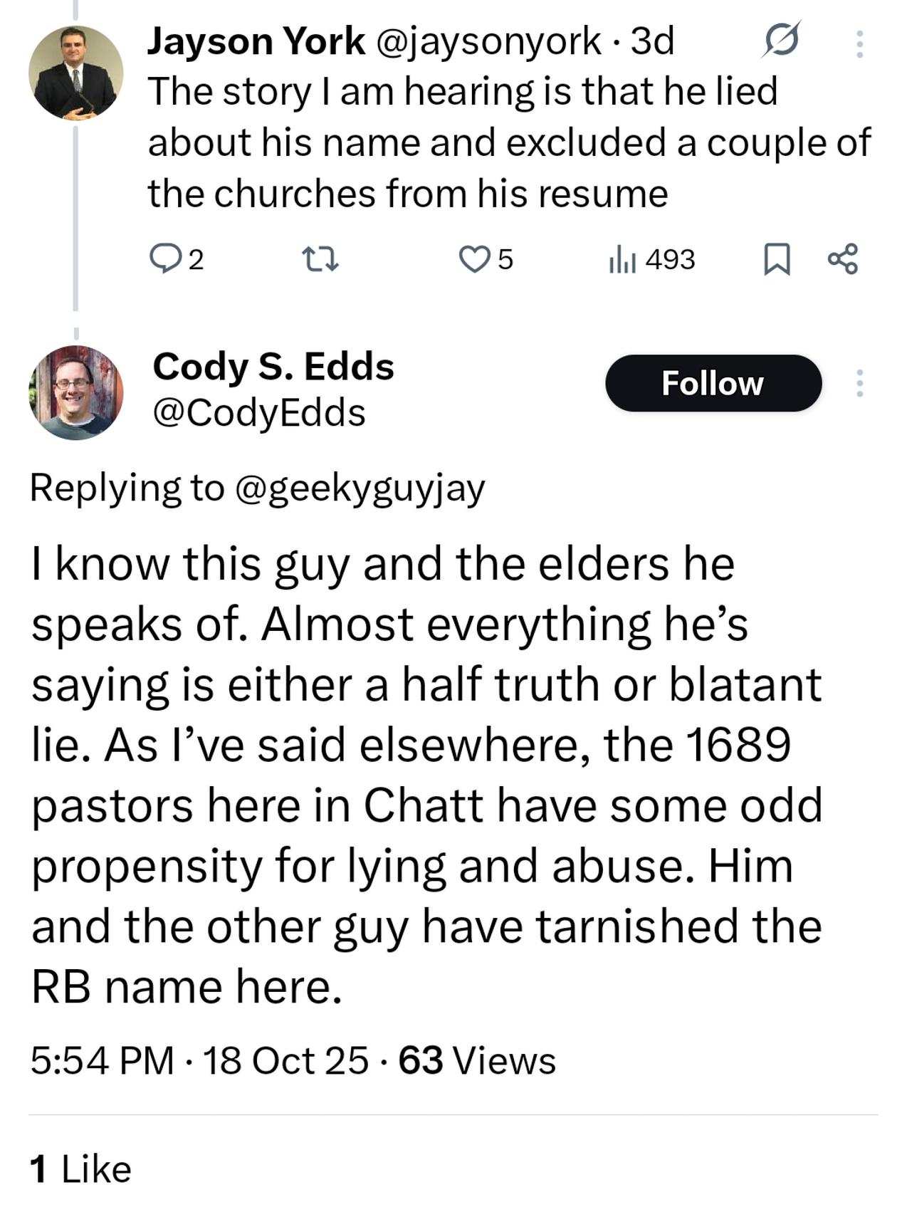 To give you an idea of the level of dishonesty we’re dealing with—Cody, above, claims he knows me. I’m not aware of ever meeting Cody—not even in passing. I do know he made some juvenile comments on the church Facebook page, and has freely spewed his ignorance, concerning me, all over social media. If I was guessing, I’d say the highly esteemed Pastor York is getting his gossip from a guy like Cody. Consider the source.