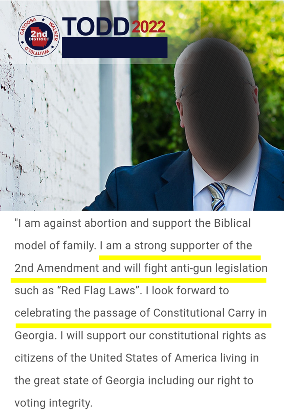 The hypocrisy of it all—is that, in 2022, Todd ran for Georgia State Senator on a platform of protecting the Second Amendment right to bear arms—yet, he tried to get me fired for doing exactly that; using my firearm to protect a woman from a vicious dog. Furthermore, in a day when churches are increasingly targeted for violence, Todd literally argued that pastors shouldn’t carry a gun. The only thing Todd appears to be concerned about protecting is his carefully manicured political persona.