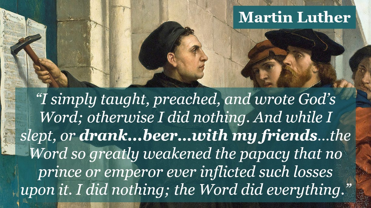 Unfortunately, after decades of ruling the roost in their own homes, Immanuel’s meddlesome madams mistakenly thought they might, as well, tell me what I could or couldn’t do in my home. I patiently tried to explain that beer and cigars are not inherently sinful, and that what I do in the privacy of my own home (or backyard), on my own time, so long as it’s not sin, is not a matter of church business. I tried to reason with everyone that Jesus drank wine regularly, choosing wine as the symbol of our redemption, and that the great Baptist preacher, Charles Spurgeon, smoked cigars, even as Martin Luther drank beer—all to the glory of God.